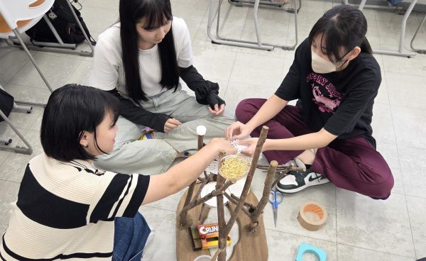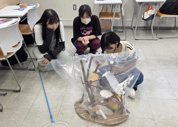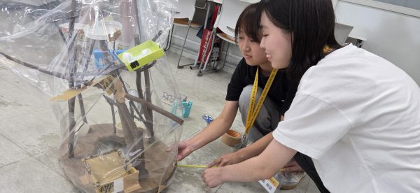 虫が苦手な学生もいましたが、自分達の作った家の中でバッタが遊ぶ様子には興味を持ったようで、近づいて観察していました🔍