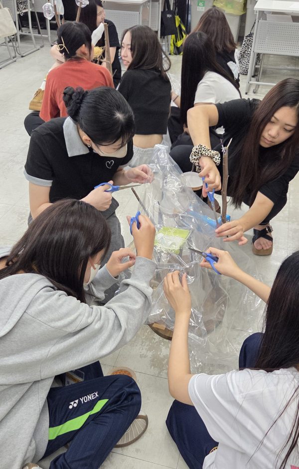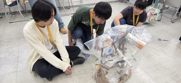 各グループの作った家を発表してもらった後は、息ができる穴をハサミで開け、バッタが逃げないように上からビニール袋を被せました✂️