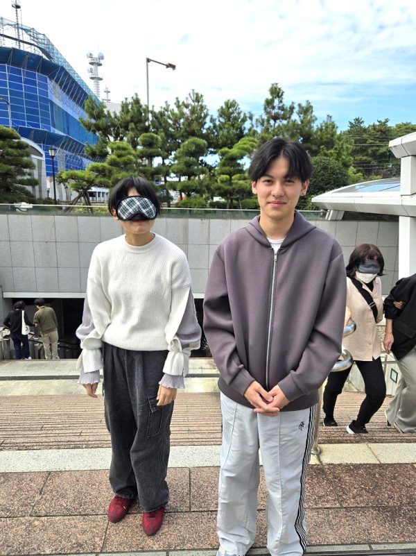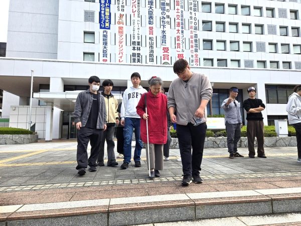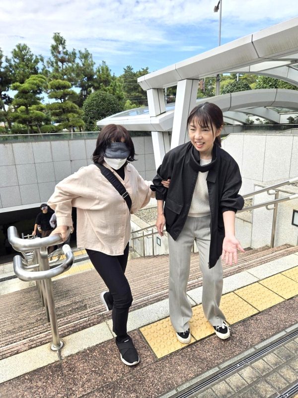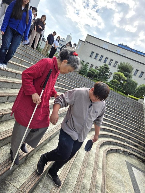 この授業では、視覚障がいのある方の外出支援を想定し、学生がペアになってアイマスクを装着し、誘導者と体験者の両方の立場を学びました。