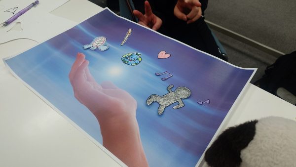 この日は、まず自分の好きな写真を選び、それに合わせて別の紙にイラストを描き、貼り付けて“オリジナルの世界観”を表現しました。