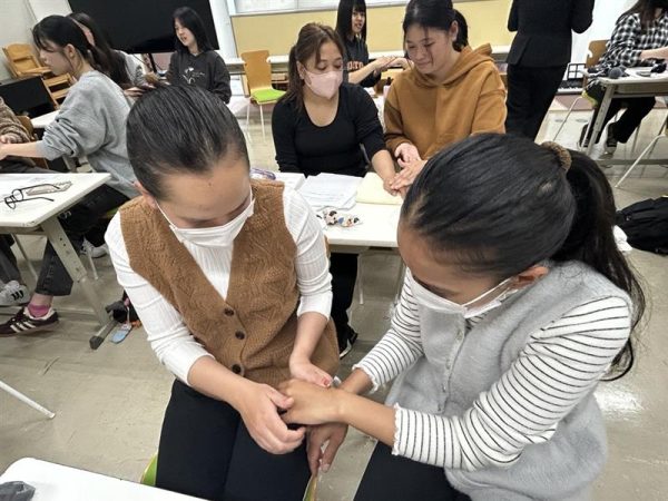 11月17日(月)介護福祉科2年生は「こころとからだのしくみ」の授業で株式会社彩さ美より講師を3名お招きして、介護美容に関するハンドマッサージ等のトリートメント授業をしていただきました❣️