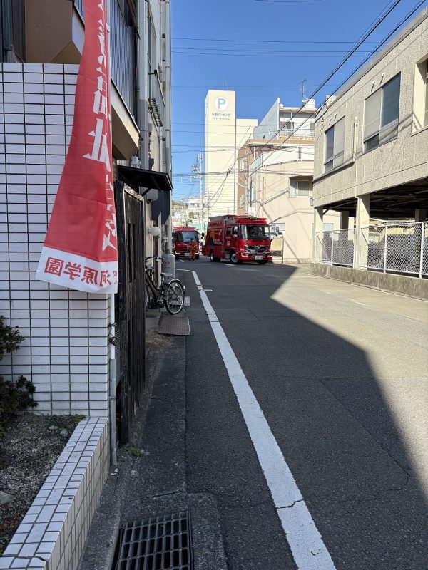 地震の影響か学校近隣に消防車が活動しておりました。