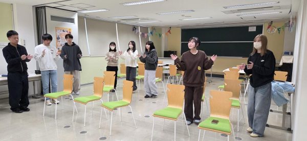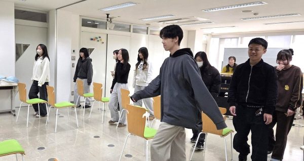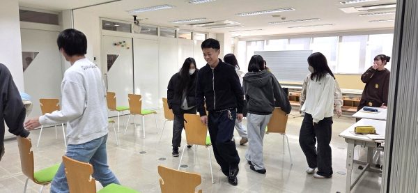 実際に身体を動かしながら様々なリズム遊びを学んでいる学生達。