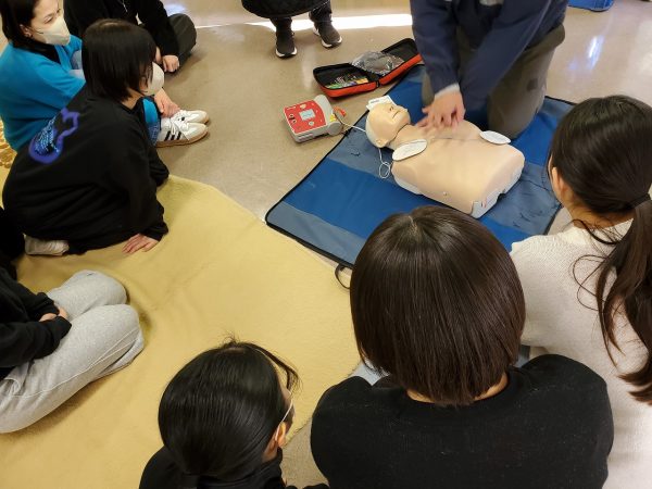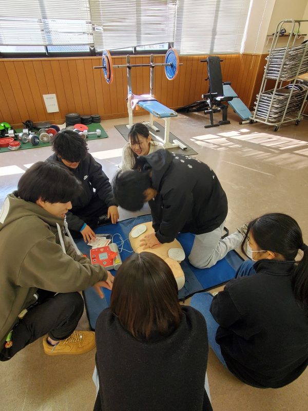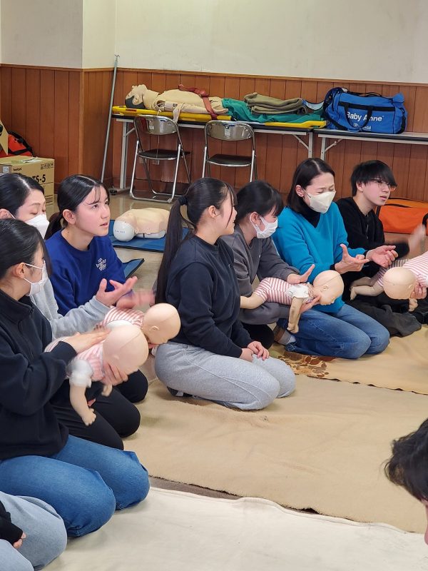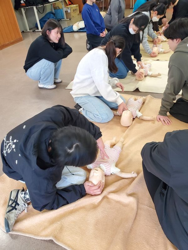 学生が受講した講習は、「普通救命講習Ⅲ」というもので、主に小児・乳児を対象とした救命講習です。胸骨圧迫、人工呼吸などの心肺蘇生法、AEDの使用方法、誤嚥や喉詰まり時の対処法を実技中心に学びました。